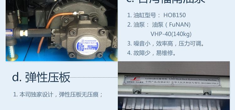 6. 彈性壓板無壓痕,整張面板好放書,安全保護全方位,壓力調節(jié)特方便,無需提書可連續(xù)操作。本機最大壓力為20T,壓力大小還可根據客戶需要定制。