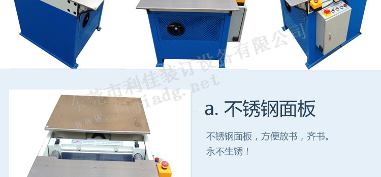 2. 調節(jié)方便:放書位觸動開關為光電開關,并設有時間調節(jié),方便厚薄書放書;機器右邊側板裝有行程開關,壓書位調整方便;機器前下邊設有壓力調節(jié)旋鈕,壓力調節(jié)方便;