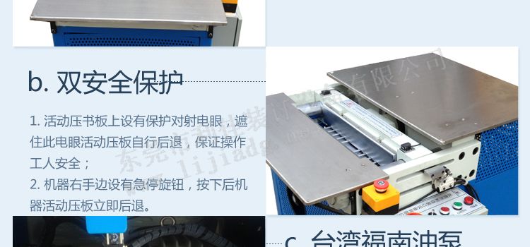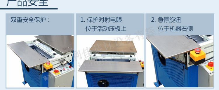 3.雙重安全保護;機器右手邊設有大頭自鎖按鈕,按下后機器活動板自行后退;活動板上設有保護對射電眼,遮住此電眼活動板自行后退從而保證人身安全;