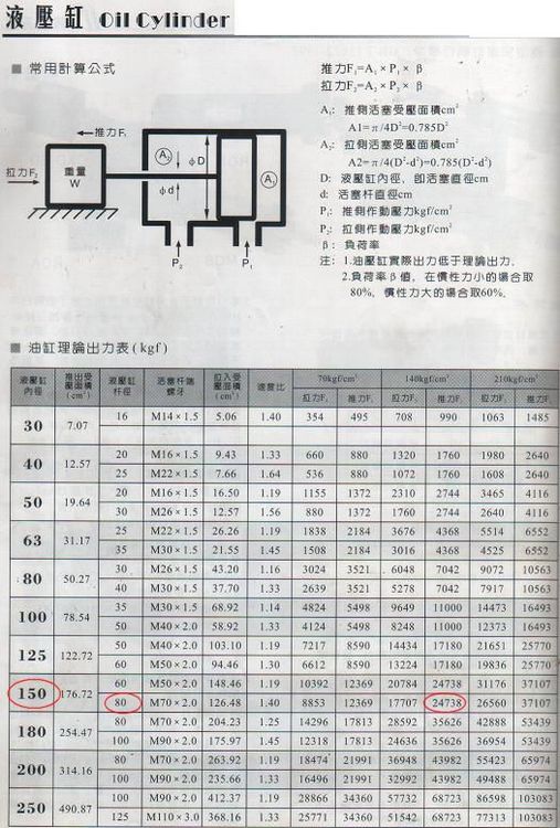 首先需知道此機的相關配置:油泵,油缸和馬達,本機油泵采用臺灣生產的福南(FUNAN)油泵VHP-40(140kg),公稱壓力:140kgf/cm2,油缸采用重型油缸:HOB150,液壓缸桿徑為80,參照油缸理論出力表,其在140kgf/cm2作用下壓力為:24738kgf=24.7噸,按80%最大壓力正常工作時壓力為:20噸,所以本機標示壓力參數為:20噸,再根據整套系統情況,保證機器動作快速穩(wěn)定,壓力可靠選定馬達功率為:5.5kw;
