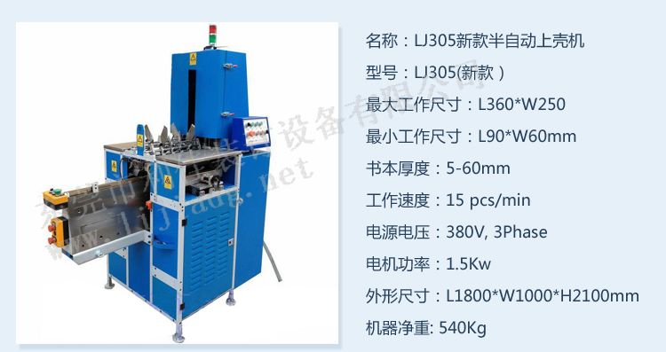 LJ305半自動(dòng)上殼機(jī)是把制作好的書芯和書殼粘接在一起的機(jī)器。此機(jī)一至二人即可操作,操作人員先放入書芯和書殼,開動(dòng)機(jī)器,自動(dòng)將書芯推入機(jī)器內(nèi)由刀板帶動(dòng)書芯上升,經(jīng)過膠滾自動(dòng)涂上兩側(cè)膠水,并繼續(xù)上升套上書殼,操作人員取下書本即完成上殼工作,機(jī)器復(fù)位再進(jìn)行下一本工作。