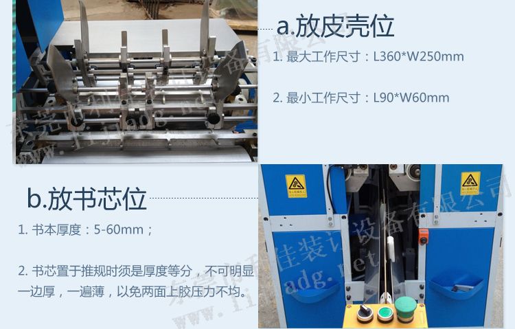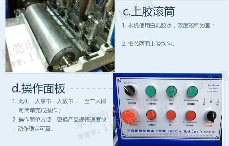 本機(jī)廣泛用于精裝書籍筆記本等需上書殼的場(chǎng)合。它具有操作簡(jiǎn)單方便,更換產(chǎn)品規(guī)格速度快,動(dòng)作穩(wěn)定可靠,書芯兩面上膠均勻,是上書殼的理想機(jī)器。